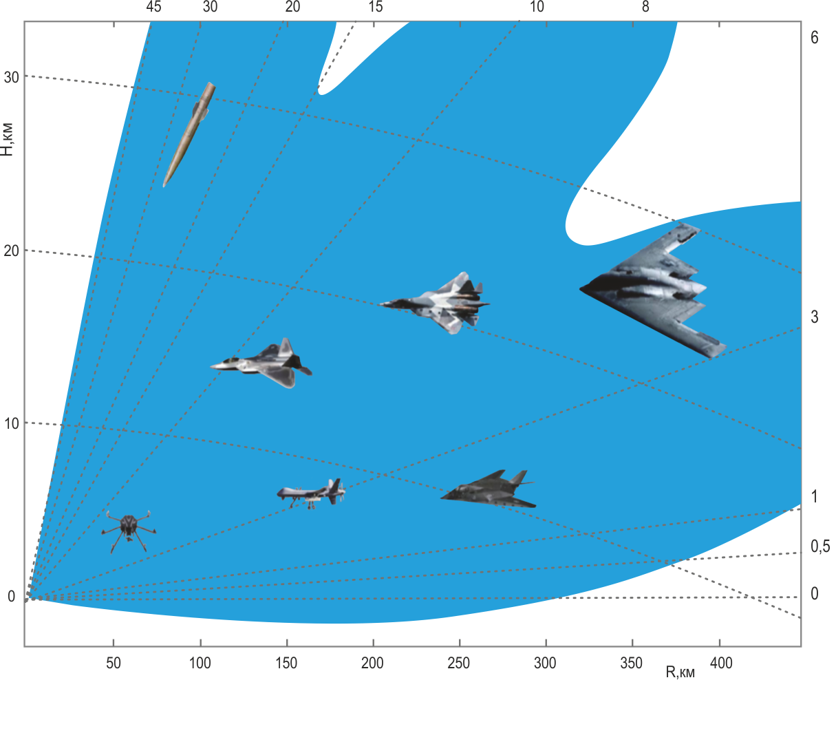 | Межа роботи радіолокатора: | |