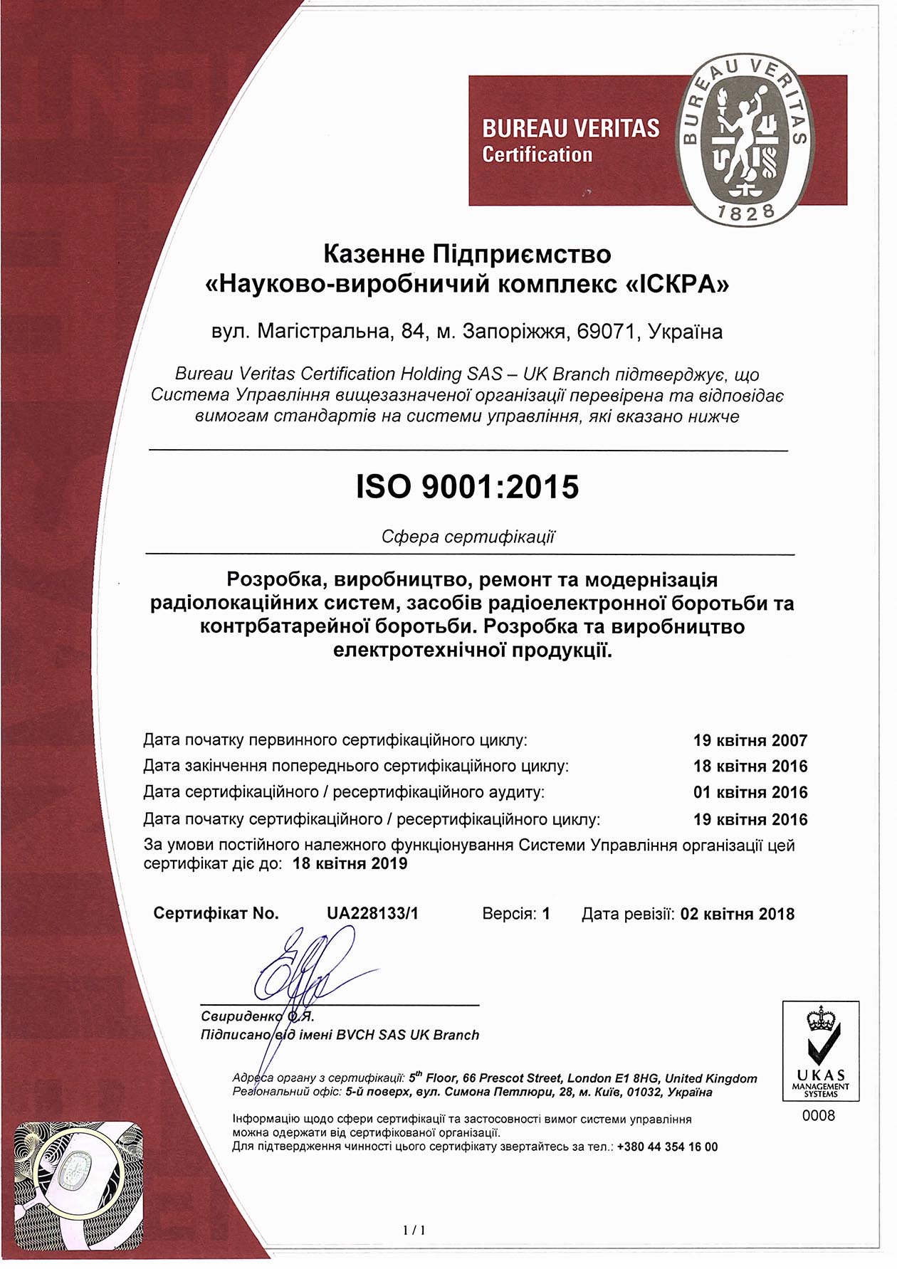 28-30 березня на підприємстві був проведений наглядовий аудит Системи менеджменту якості КП «НВК «Іскра» на відповідність до вимог міжнародного стандарту ISO 9001 з переходом на нову версію 2015.