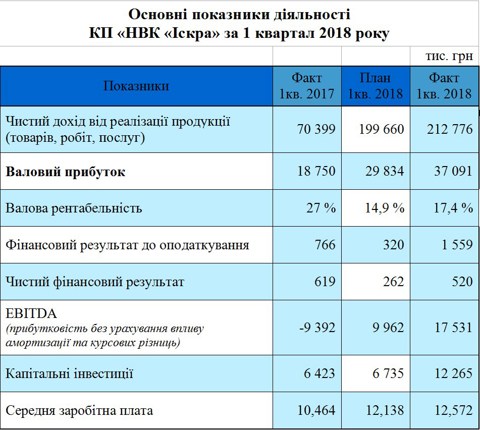 За перший квартал 2018 року чистий результат від фінансово-господарської діяльності КП «НВК «Іскра» склав 520 тис. грн, що на 258 тис. грн перевищило запланований обсяг прибутку.